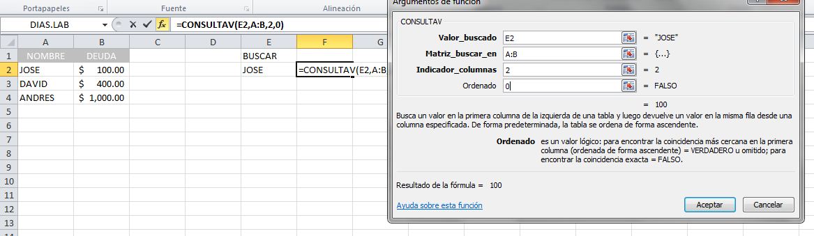 En el ejemplo en valor buscado seleccionamos en valor a buscar en la base, la cual se encuentra en las columnas A y B y queremos obtener la deuda la cual se encuentra en la 2 da columna a partir de donde tenemos en nombre a buscar. Por último el 0 nos indica que debe coincidir exactamente en dato.